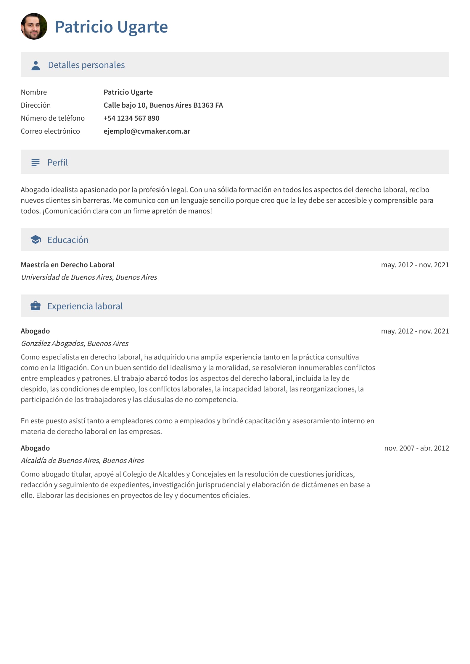 Después de seguir todos estos pasos, probablemente ya tengas una buena base y contenido para un excelente currículum legal. ¿Aún no estás seguro de cómo se ve esto en la práctica? Observa el currículum de ejemplo para un abogado aquí.