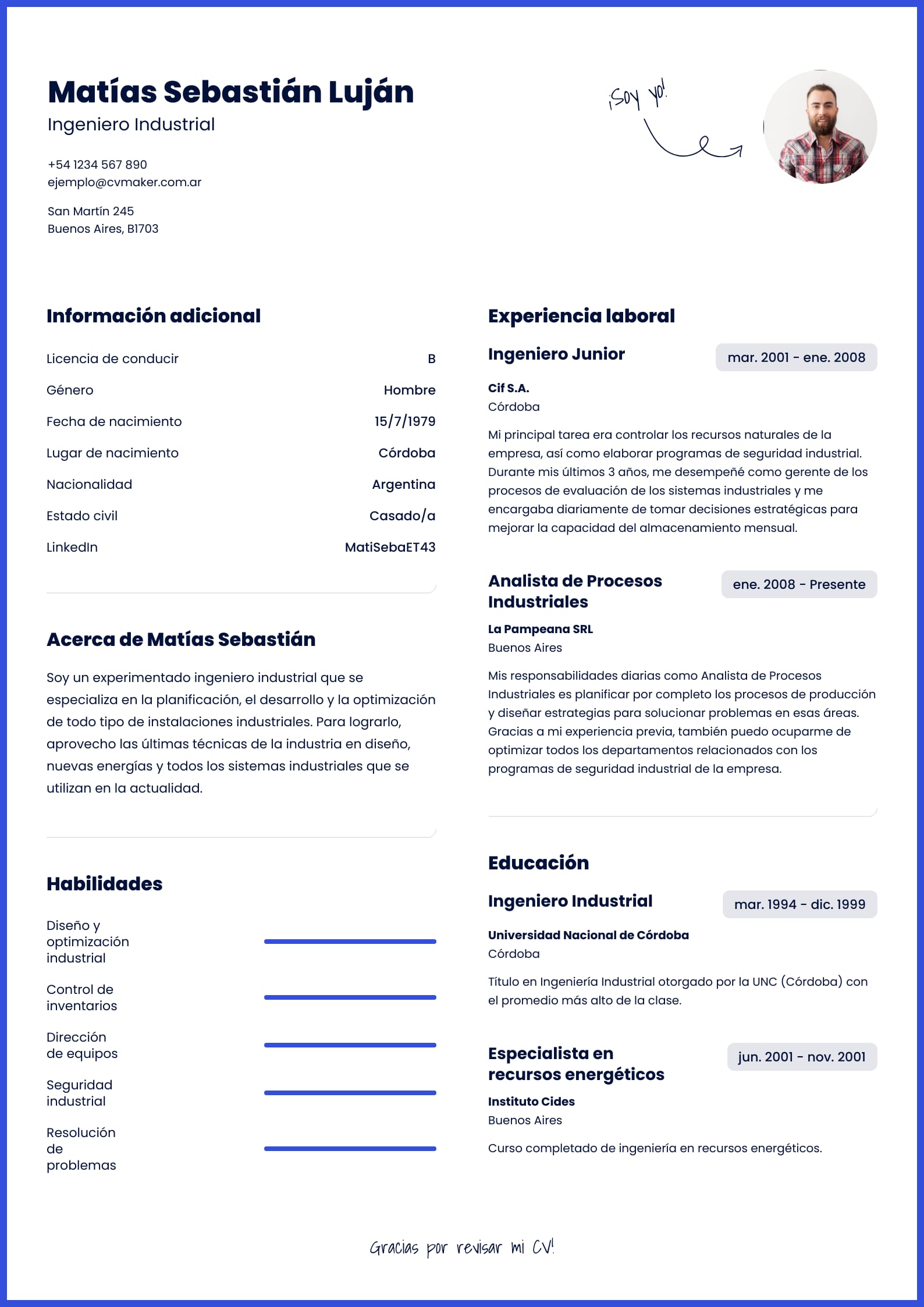 Con el objeto de que puedas entender más claramente lo que vamos a enseñarte más adelante, te dejamos un CV de ingeniero industrial como ejemplo, con todo el contenido que los profesionales del sector suelen incluir. Cabe aclarar que se trata simplemente de un ejemplo: ¡nadie va a poder redactar un currículum vitae más completo que vos! Sin embargo, todas las secciones de este artículo vienen acompañadas de explicaciones y consejos útiles para que todo te resulte mucho más fácil.